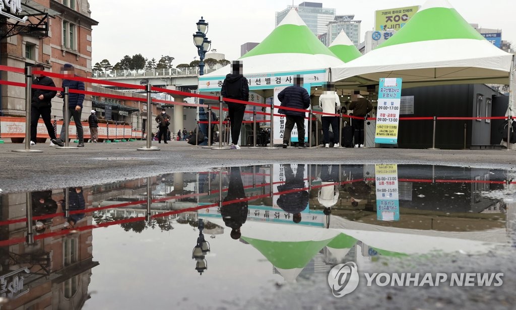 | ▲ People stand in line to get COVID-19 tests at a temporary screening station in front of Seoul Station on Feb. 14, 2021. (Yonhap) |