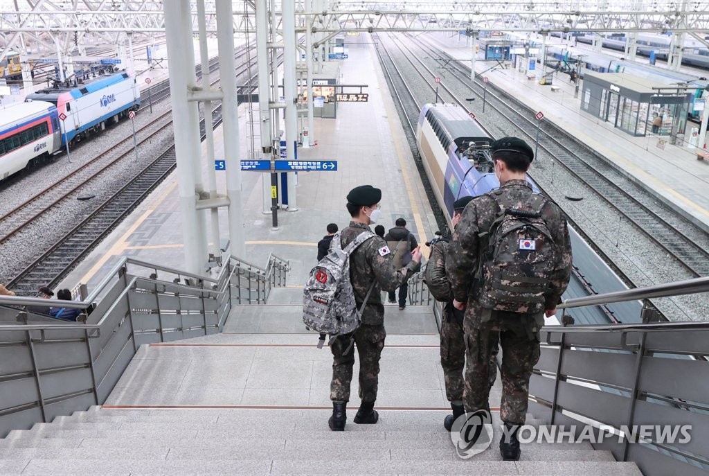 | ▲ Soldiers head to a train in Seoul Station on Feb. 15, 2021, as the military lifted a ban on their vacation under eased social distancing rules. (Yonhap) |
