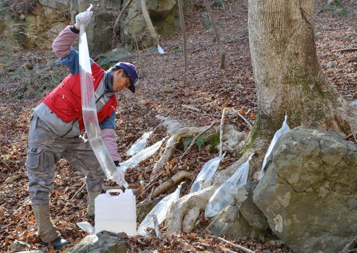 사람이 일일이 산속에 올라가 고로쇠나무에 드릴로 구멍을 뚫은 후 비닐 주머니를 매달거나 호스를 꽂아 탱크에 수액을 모은다.