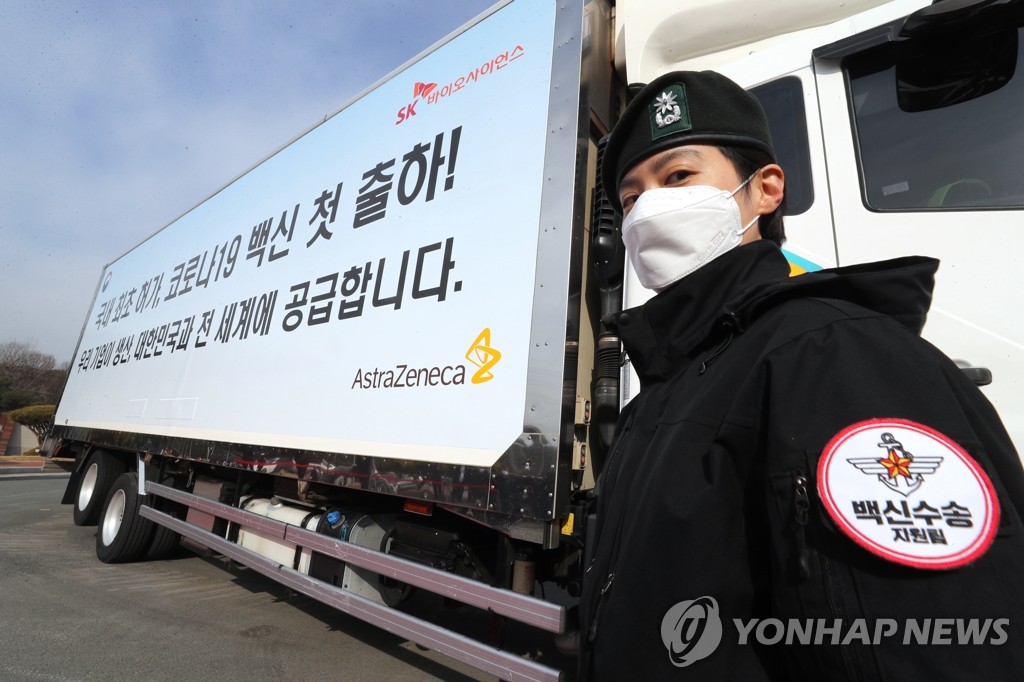 | ▲ A military official stands next to a truck carrying AstraZeneca's COVID-19 vaccines in Andong, 268 kilometers south of Seoul, on Feb. 24, 2021. (Yonhap) |