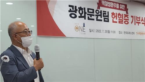 | ▲ 이희용 언론재단 경영본부장 (서울=연합뉴스) 양정우 기자 = 서울 광화문 소재 ESG(환경·사회·지배구조) 실천공동체인 광화문원팀 총 18개 기관은 25일 한국백혈병환우회에 임직원들이 헌혈 캠페인으로 모은 헌혈증 총 398장을 기부했다. 이희용 언론재단 경영본부장은 그간 헌혈해 모은 126장의 헌혈증을 기부를 위해 내놨다. 2022.7.25 eddie@yna.co.kr (끝) |