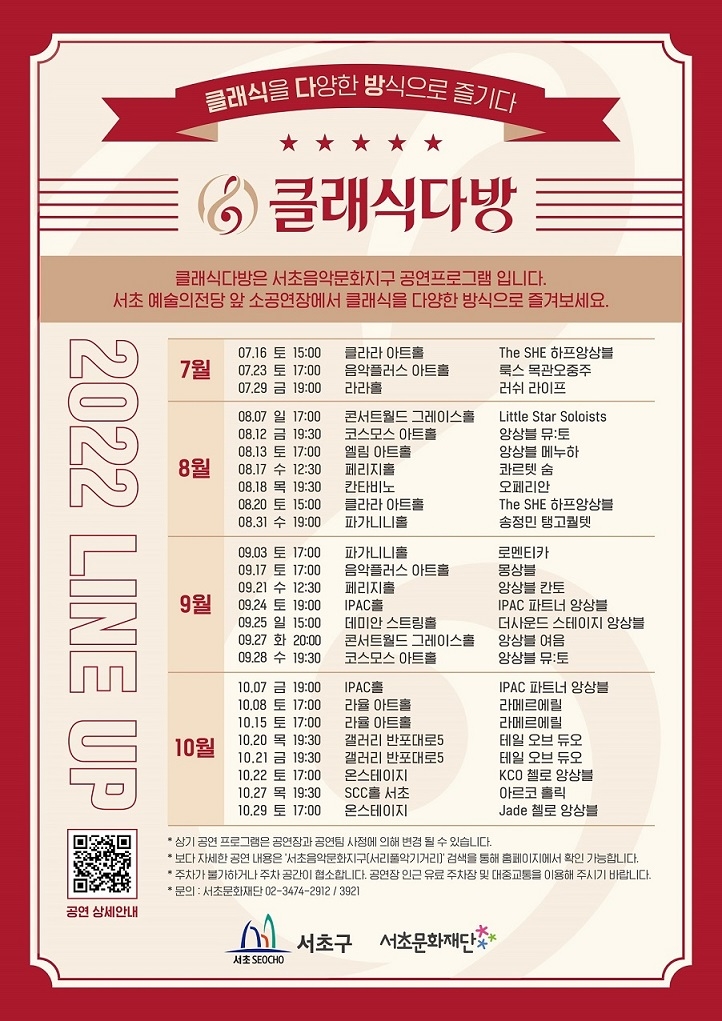 전성수 서초구청장은 "앞으로도 코로나19로 침체한 공연장과 음악 문화예술인들에게 다양한 지원방안을 마련하겠다"며 "구민들의 문화 갈증 해소에도 더욱 노력하겠다"고 말했다.