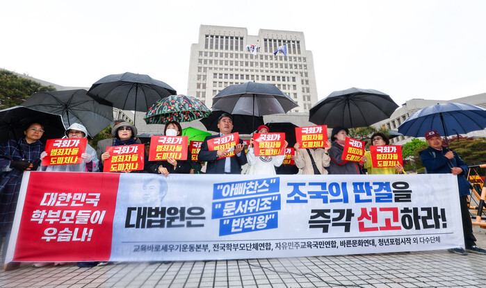 Members from organizations of school parents hold a news conference in front of the Supreme Court in Seoul on April 15, 2024, calling for a swift verdict to be handed down to Cho Kuk, former justice minister and current head of the minor Rebuilding Korea Party, regarding his irregularities concerning his children's admission to universities. Cho was sentenced to two years in prison by a lower court in February. (Yonhap)