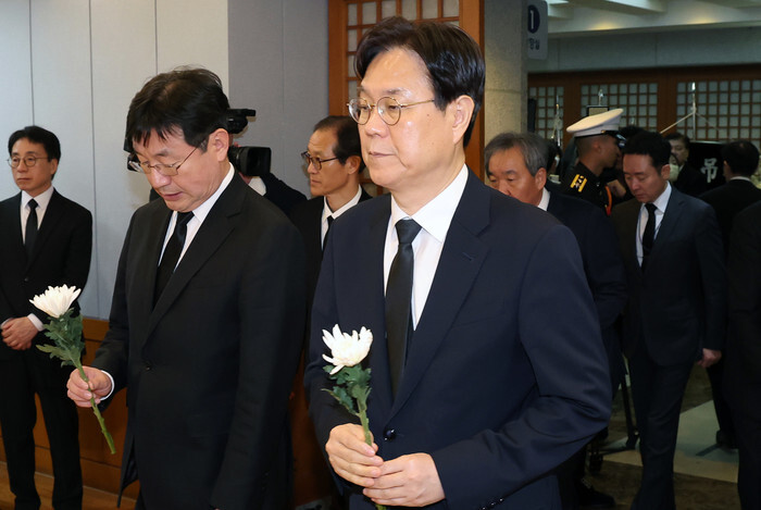 Presidential Chief of Staff Lee Kwan-sup (R) pays respect at the memorial altar for Son Myung-soon, spouse of the late former President Kim Young-sam, at Seoul National University Hospital in the capital on March 8, 2024. The former first lady died at the age of 95 the previous day. (Pool photo) (Yonhap)
