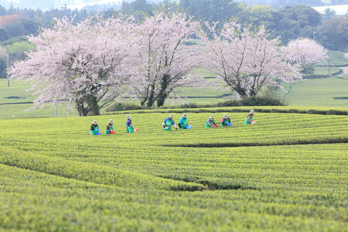 Workers harvest tea leaves on South Korea' southern Jeju Island on April 5, 2024. (Yonhap)