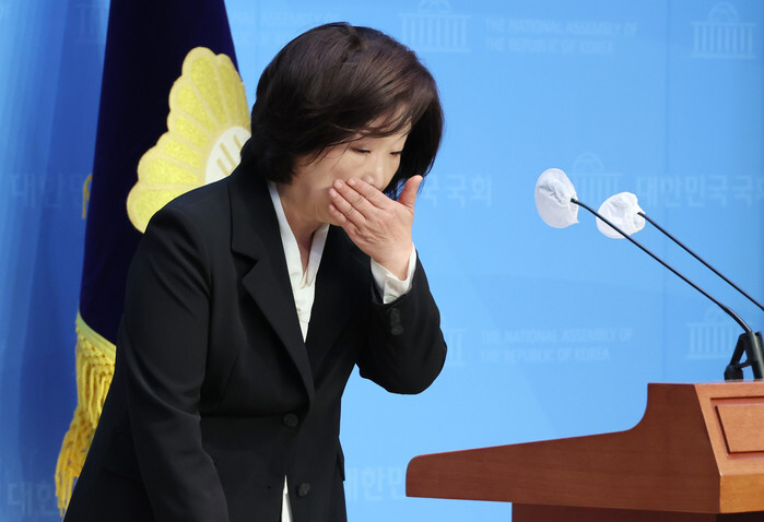 Sim Sang-jeong, a candidate of the progressive minor Green Justice Party, weeps after a news conference at the National Assembly in Seoul on April 11, 2024, as she declared her departure from the political arena, marking the end of 25 years in progressive politics. She was defeated in the general elections held the day before. (Yonhap)