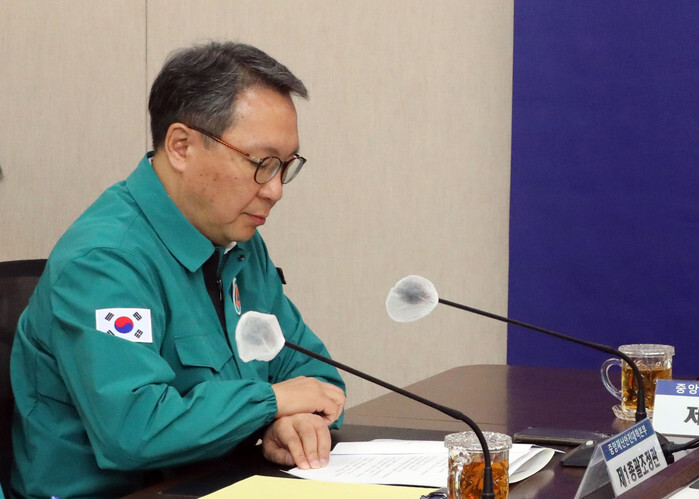 Vice Health Minister Park Min-soo attends a meeting at the Central Disaster and Safety Countermeasures Headquarters in Sejong, 113 kilometers south of Seoul, on April 15, 2024, to address a prolonged nationwide walkout by trainee doctors. On the same day, more than 1,300 trainee doctors, who have resigned in protest against the government's plan to augment the number of medical students, filed a complaint against Park on charges of abusing power in the pursuit of the plan. (Yonhap)