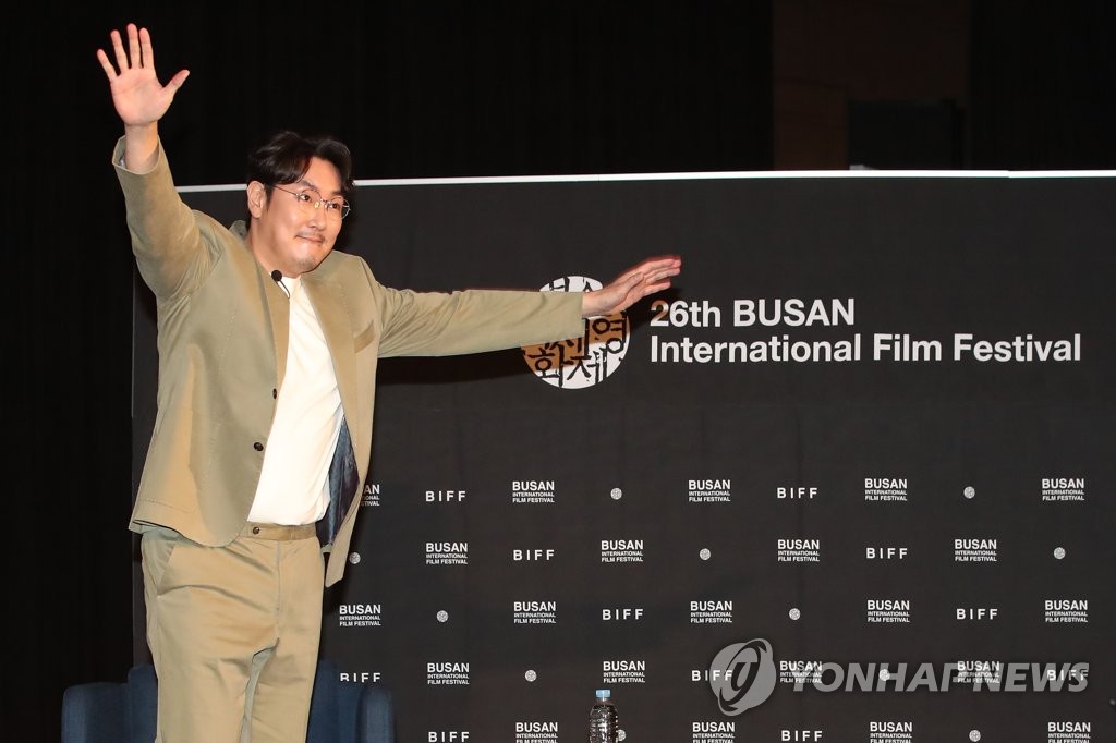 ▲ 조진웅 '관객 환호에 큰 포즈로 화답' (부산=연합뉴스) 강민지 기자 = 배우 조진웅이 9일 오후 부산 해운대구 KNN시어터에서 열린 제26회 부산국제영화제 스페셜 토크 프로그램 '액터스 하우스'에서 포즈를 취하고 있다. 2021.10.9 mjkang@yna.co.kr
