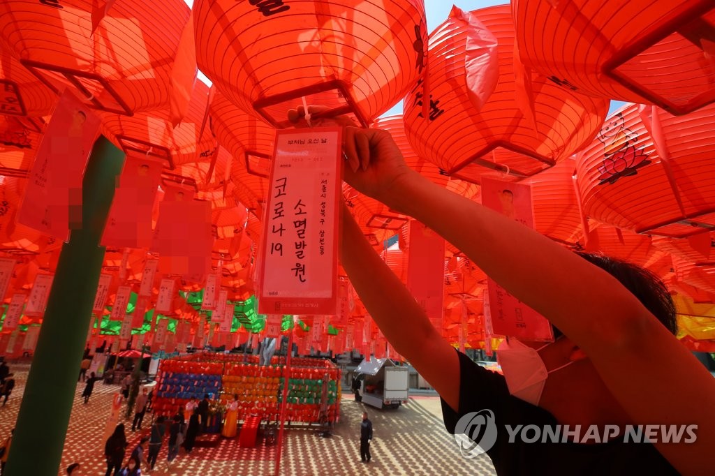 | ▲ A Buddhist follower hangs a lantern with a message wishing for the end of the COVID-19 pandemic at a temple in central Seoul on May 18, 2021. (Yonhap) |