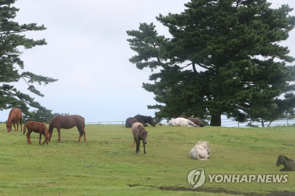 | ▲ 가을 초원 위의 제주마 (제주=연합뉴스) 고성식 기자 = 11일 제주시 마방목지 푸른 초원 위에서 천연기념물 제주마(馬)들이 풀을 먹거나 쉬고 있다. 2021.9.11 koss@yna.co.kr |