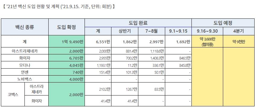 정부가 개별 제약사 및 국제기구와 계약하거나 국제협력을 통해 확보한 백신은 모더나, 화이자, 아스트라제네카, 얀센, 노바백스 5종 총 1억9천490만회분이다.