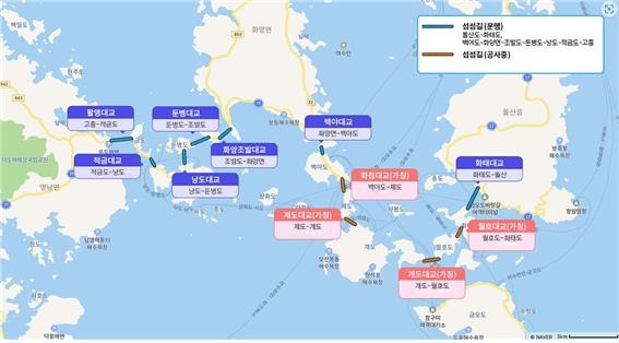화양∼조발 대교(854m), 둔병대교(990m), 낭도대교(640m), 적금대교(470m), 화태대교(1.3㎞), 백야대교(325m),·팔영대교(1.3㎞), 화태도∼월호도∼개도∼제도∼백야도 구간 해상 교량 4개다.