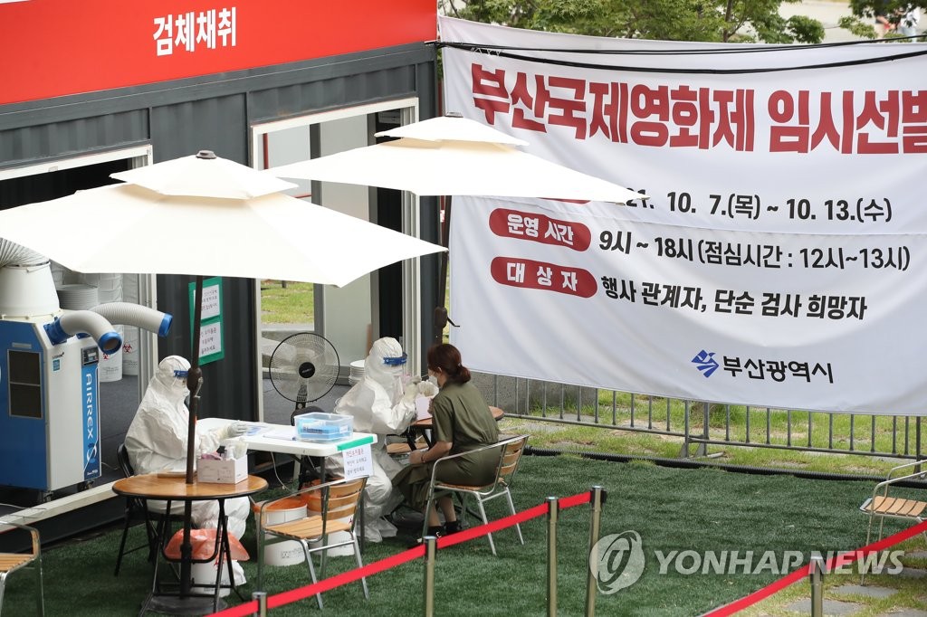 | ▲ 부산국제영화제에 마련된 임시선별진료소 (부산=연합뉴스) 강민지 기자 = 부산 해운대구 영화의전당에 마련된 임시선별진료소에서 영화팬 등 검사 희망자들이 검체 채취를 하고 있다. 2021.10.8 mjkang@yna.co.kr |