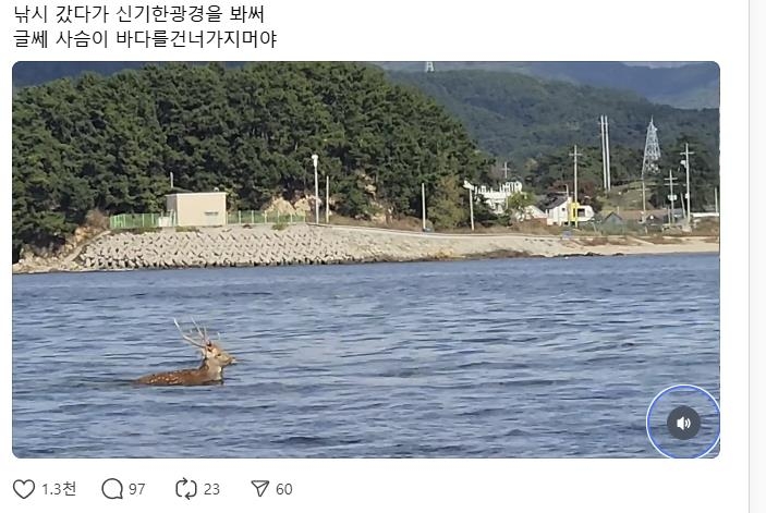 지난 9일 사회관계망서비스(SNS) 스레드에는 소쿠리섬 인근에서 헤엄을 치는 생소한 사슴 영상이 게시돼 1천개가 넘는 공감 표시를 받았다.