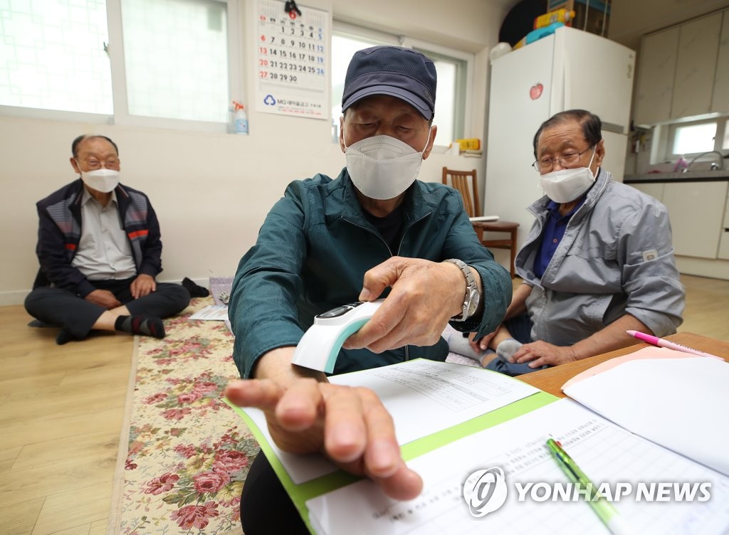 | ▲ An elderly man checks his temperature in a senior community center in western Seoul on June 1, 2021, which opened to members who have received COVID-19 vaccine jabs. (Yonhap) |