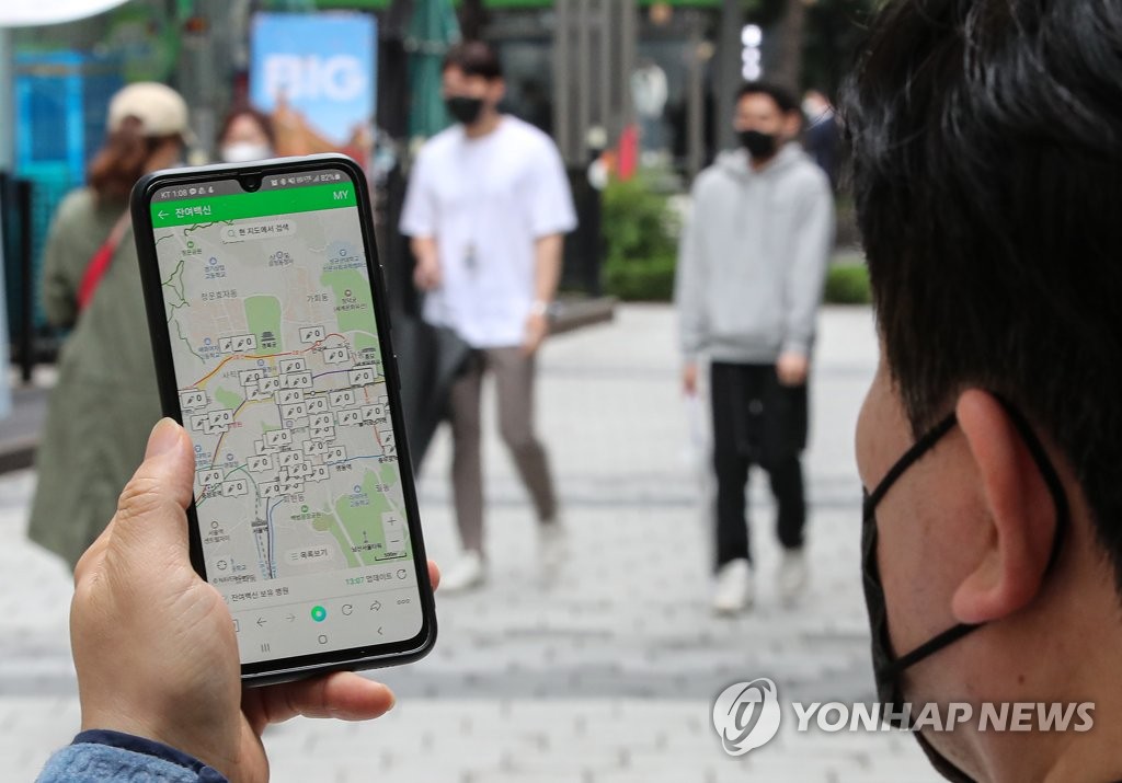 | ▲ A citizen searches for clinics with remaining COVID-19 shots in central Seoul on May 27, 2021. (Yonhap) |