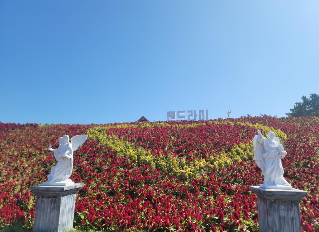 맨드라미 문자 조형물, 빨간 공중전화부스, 하트 조형물 포토존을 마련해 맨드라미와 함께 하는 아름다운 풍경이 눈길을 사로잡았다.