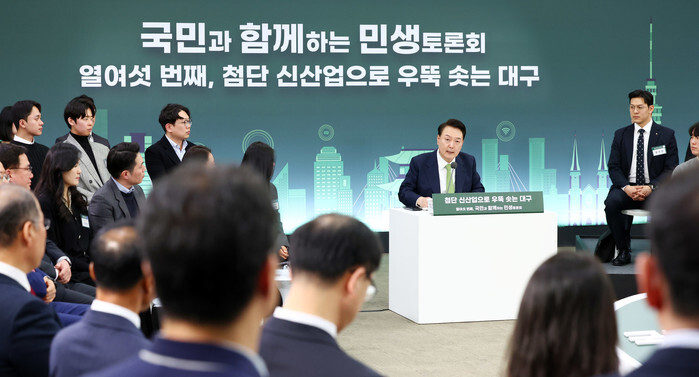 President Yoon Suk Yeol (C) speaks during the 16th debate forum on improving people's livelihoods at Kyungpook National University in Daegu, 237 kilometers southeast of Seoul, on March 4, 2024. (Pool photo) (Yonhap)