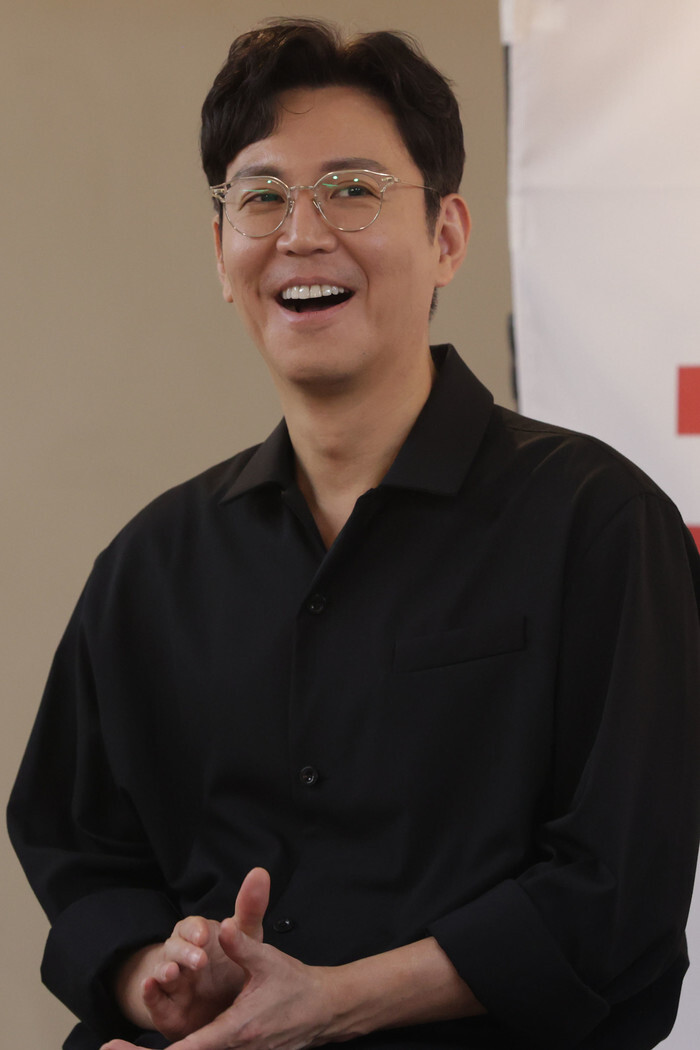 South Korean actor Choi Won-young listens to reporters' questions during a rehearsal for the new play "Rendezvous" in Seoul on Aug. 7, 2024. The play will runs from Aug. 24 to Sept. 21. (Yonhap)