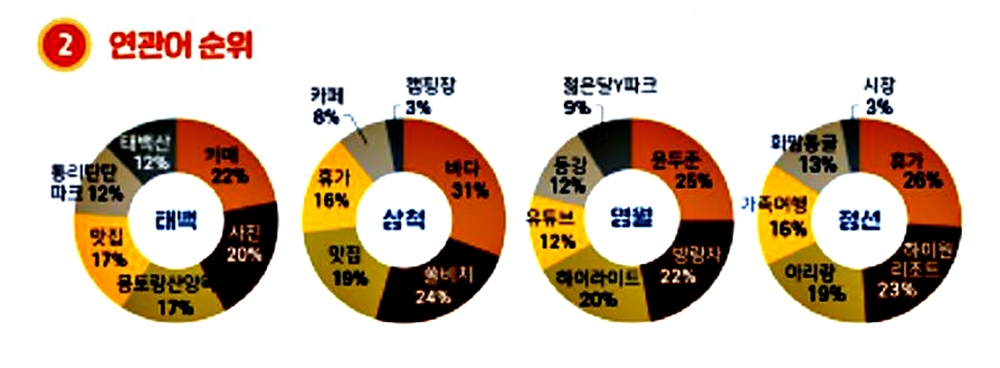 올해 3분기 'MZ세대'(1980∼2000년대 출생)의 주력 SNS인 인스타그램 해시태그의 연관어 지역별 1위는 삼척 '삼척바다', 영월 '젊은 달 Y 파크', 정선 '하이원리조트', 태백 '몽토랑산양목장'이다.