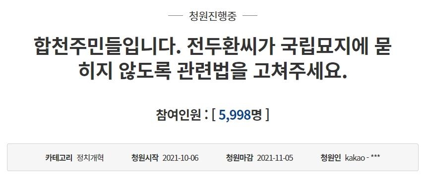 최근 국민청원 게시판에 '합천주민들입니다. 전두환씨가 국립묘지에 묻히지 않도록 관련법을 고쳐주세요'라는 글이 올라왔다.