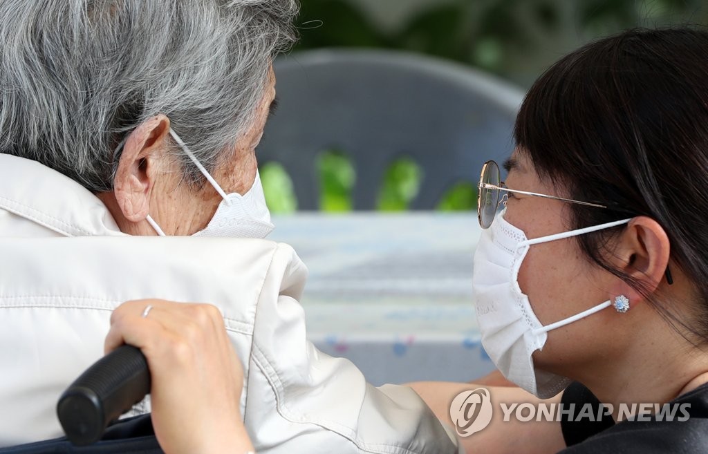 ▲ "엄마, 내일이 추석이에요" (춘천=연합뉴스) 양지웅 기자 = 추석을 하루 앞둔 20일 오전 강원 춘천시의 한 요양원에서 입소 어르신이 딸과 면회하며 대화하고 있다. 2021.9.20 yangdoo@yna.co.kr