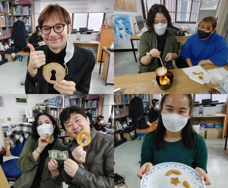 | ▲ '오징어 게임'에 나오는 달고나 게임을 하는 반크 미국 대학생 인턴들 사진 왼쪽 위부터 시계방향으로 커티스 펠드너, 머라이어 압델파타와 새라 니시, 압델파타와 박기태 반크 단장, 엘리슨 가르바즈 씨.[반크 제공] |