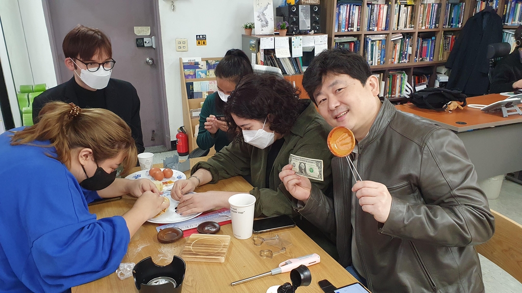 | ▲ 드라마 '오징어 게임'에 나오는 달고나 게임을 하는 반크 미국 대학생 인턴들 [반크 제공] |