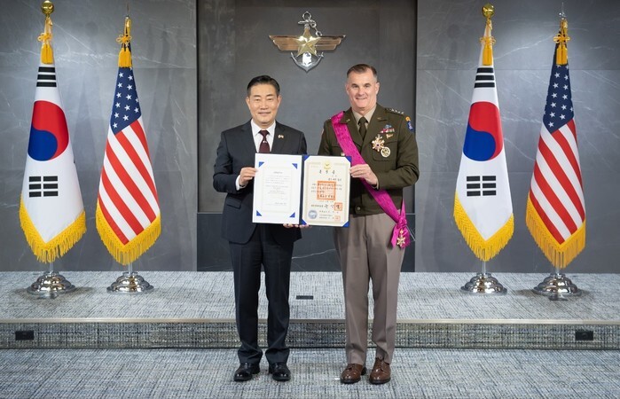 South Korean Defense Minister Shin Won-sik (L) poses for a photo with Gen. Charles Flynn, commander of the U.S. Army Pacific, after presenting him a national order of merit at the defense ministry in Seoul on April 4, 2024, in this photo provided by the ministry. (PHOTO NOT FOR SALE) (Yonhap)
