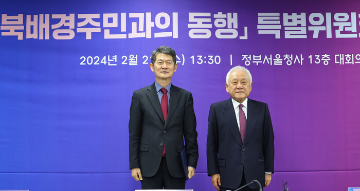 Kim Han-gil (R), the chief of the presidential committee on national unity, poses for a photo with Lee Hyun-chool, the head of a state-run special committee for strengthening support for North Korean defectors, after presenting Lee with a letter of appointment during a ceremony to launch the committee at the government complex in Seoul on Feb. 21, 2024. (Yonhap)