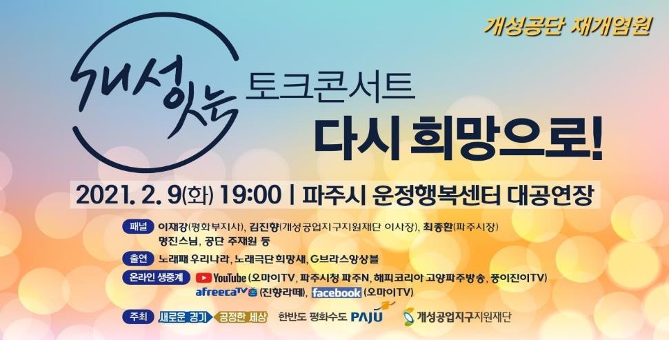파주 운정행복센터에서 진행되는 콘서트에는 이재강 평화부지사, 최종환 파주시장, 김진향 개성공업지구지원재단 이사장, 명진 스님, 공단 주재원 등이 패널로 참여할 예정이다.
