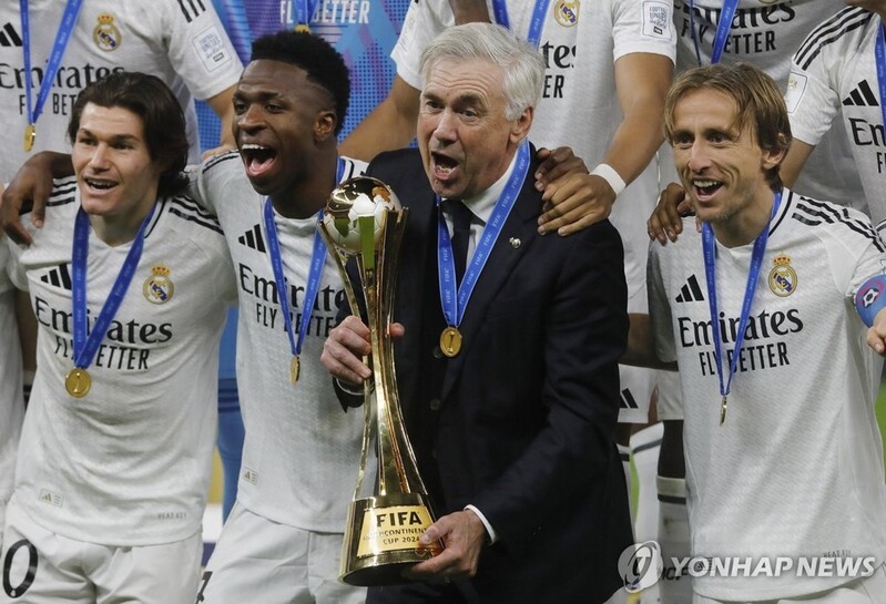 | ▲ 2024 FIFA 인터콘티넨털컵 우승 트로피를 들고 기뻐하는 레알 마드리드 선수들 [AP=연합뉴스] |