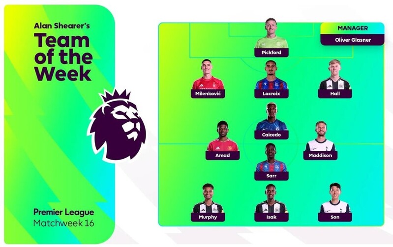 EPL 사무국은 18일(한국시간) 앨런 시어러가 선택한 2024-2025 EPL 16라운드 '이주의 팀'을 발표하며 손흥민을 왼쪽 날개 공격수로 뽑았다.