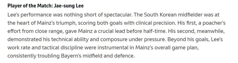 이어 "이재성의 두 번째 득점은 압박 속에서 기술적인 능력과 침착함을 잘 보여줬다"며 "이재성은 득점뿐만 아니라 마인츠의 전반적인 게임 플랜에 핵심적인 역할을 수행했고, 뮌헨의 미드필더와 수비수들을 끊임없이 괴롭혔다"고 강조했다.