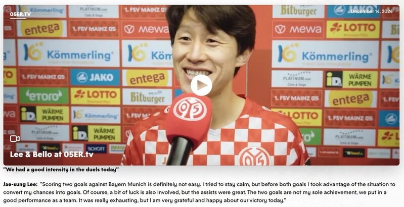 | ▲ 마인츠 구단과 인터뷰하는 이재성 [마인츠 홈페이지 캡처. 재판매 및 DB 금지] |