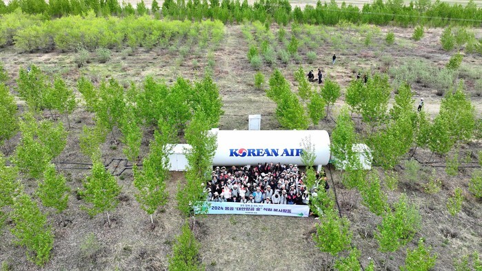 Korean Air employees and local residents hold a ceremony to mark the 20th anniversary of the South Korean carrier's "Global Planting Project" in the Korean Air Forest in the Baganuur Desert in Ulaanbaatar, Mongolia, on May 28, 2024. The project kicked off in 2004 in a bid to stop desertification in the area. About 125,000 trees are currently growing in the desert. (Yonhap)