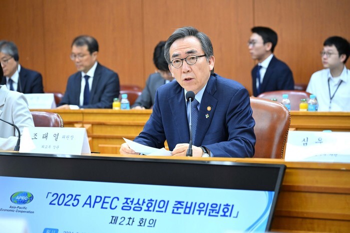 Foreign Minister Cho Tae-yul speaks during a meeting of the preparatory committee for the Asia-Pacific Economic Cooperation (APEC) Summit 2025 at the foreign ministry in Seoul on June 27, 2024. The meeting resolved to tap the ancient city of Gyeongju, 277 kilometers southeast of Seoul, as the venue for the summit. Gyeongju was the capital of the Silla Dynasty (57 B.C.-A.D. 935). (Yonhap)