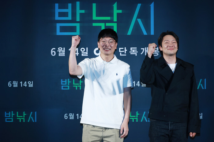 South Korean actor Son Seok-koo (R), who stars in the new movie "Night Fishing," poses for a photo along with director Moon Byung-gon during a publicity event in Seoul on June 11, 2024, to promote the movie that is set to hit local screens in South Korea on June 14. (Yonhap)