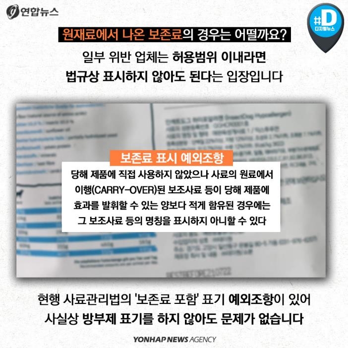 현행 사료관리법의 '보존료 포함' 표기 예외 조항이 있어 사실상 방부제 표기를 하지 않아도 문제가 없습니다.