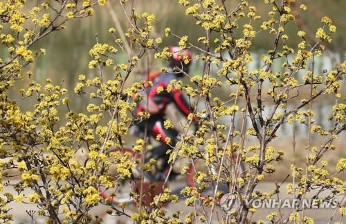 (광주=연합뉴스) 조남수 기자 = 절기 경칩인 지난 5일 광주 서구 광주천변에서 한 시민이 자전거를 타고 산수유꽃이 핀 산책로를 지나고 있다. 2021.3.5