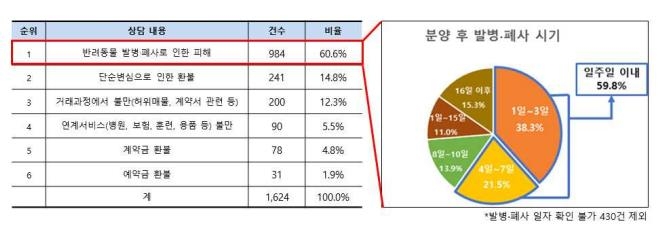 분양 관련 피해 가운데 반려동물 발병·폐사로 인한 피해가 60.6%를 차지해 가장 많았다.