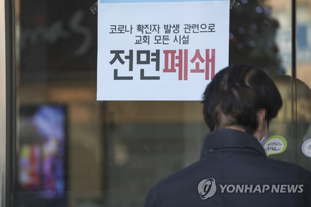▲ This photo taken Dec. 5, 2021, shows a notice that reads all the facilities of a church in Incheon, 40 kilometers west of Seoul, are closed amid fears over the spread of the omicron variant. (Yonhap)