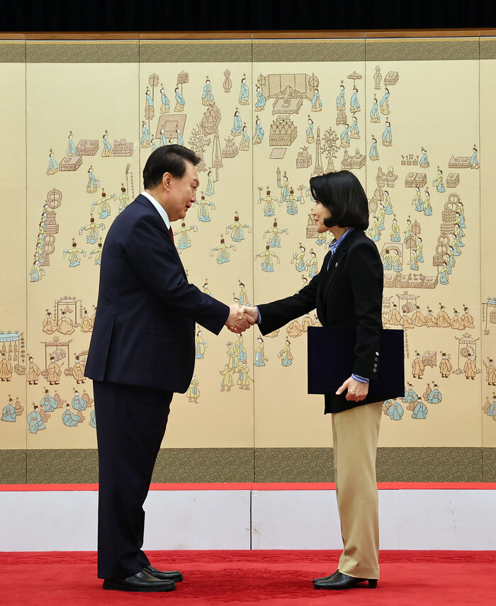 President Yoon Suk Yeol shakes hands with Lee Jin-sook after presenting her a letter of appointment as the new head of the Korea Communications Commission at the presidential office in Seoul on Aug. 1, 2024. (Yonhap)