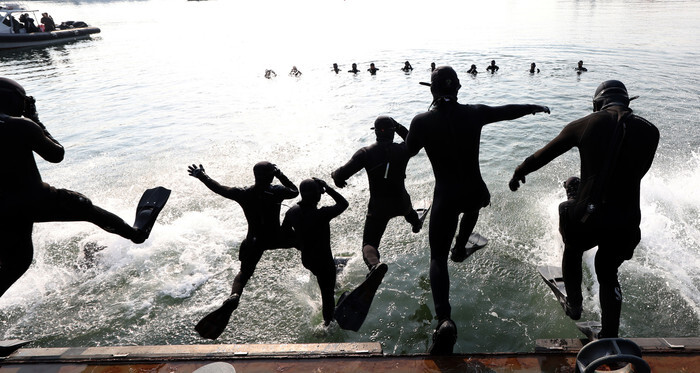 Members of the naval special warfare force's sea salvage and rescue unit (SSU) jump into waters off the naval port of Jinhae, some 410 kilometers southeast of Seoul, as they train during a bitter cold spell on Jan. 18, 2023. (Yonhap)