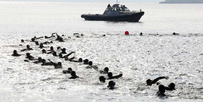 Members of the naval special warfare force's sea salvage and rescue unit (SSU) train in waters off the naval port of Jinhae, some 410 kilometers southeast of Seoul, during a bitter cold spell on Jan. 18, 2023. (Yonhap)