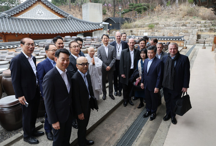 Industry and Trade Minister Ahn Duk-geun (C, in grey suit) poses for a photo with a group of foreign investors during a visit to Jingwan Temple in Seoul on April 3, 2024. (Yonhap)