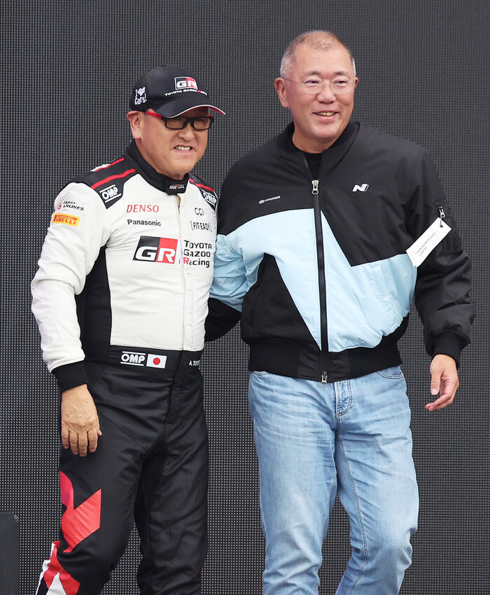 Hyundai Motor Group Executive Chair Euisun Chung (R) and Toyota Motor Corp. Chairman Akio Toyoda greet participants in the Hyundai N x Toyota Gazoo Racing Festival at the speedway of the Everland amusement park in Yongin, about 40 kilometers south of Seoul, on Oct. 27, 2024. (Yonhap)