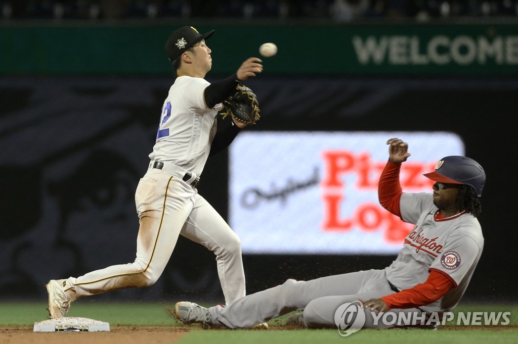 | ▲  In this USA Today Sports photo via Reuters, Pittsburgh Pirates' shortstop Park Hoy-jun (L) turns a double play over Josh Bell of the Washington Nationals during the top of the sixth inning a Major League Baseball regular season game at PNC Park in Pittsburgh on April 15, 2022. (Yonhap) |