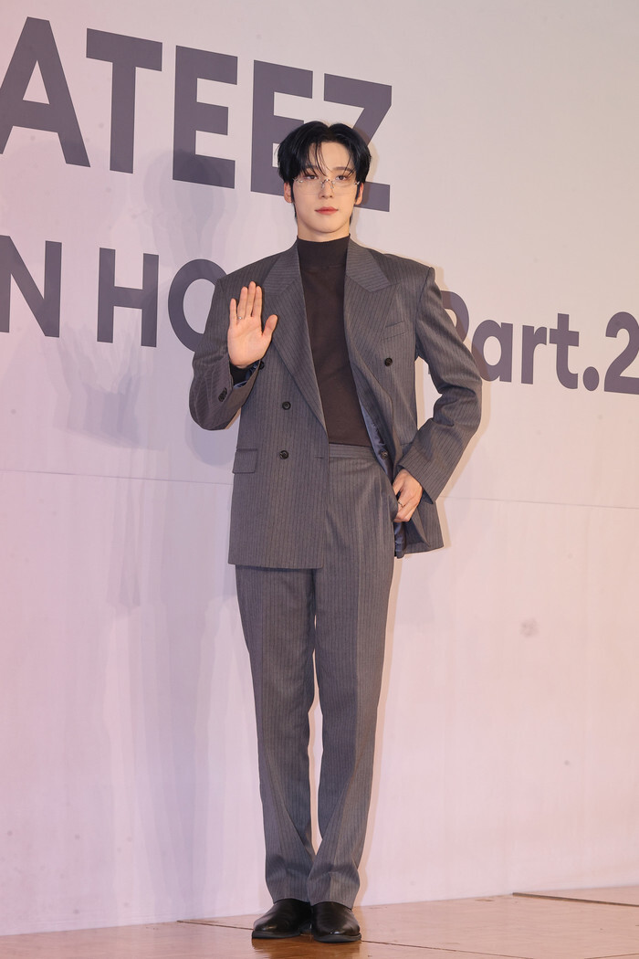 Yunho, a member of South Korean boy group Ateez, poses for a photo during a showcase to promote the group's eleventh mini album "Golden Hour: Part 2" in Seoul on Nov. 14, 2024. (Yonhap)
