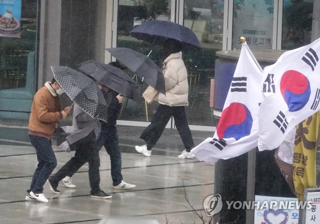 | ▲ 봄비 내리는 3·1절 (서울=연합뉴스) 백승렬 기자 = 봄비가 내린 3·1절인 1일 서울시 종로구 종각 네거리에서 시민들이 우산을 쓰고 지나고 있다. 2021.3.1 srbaek@yna.co.kr |